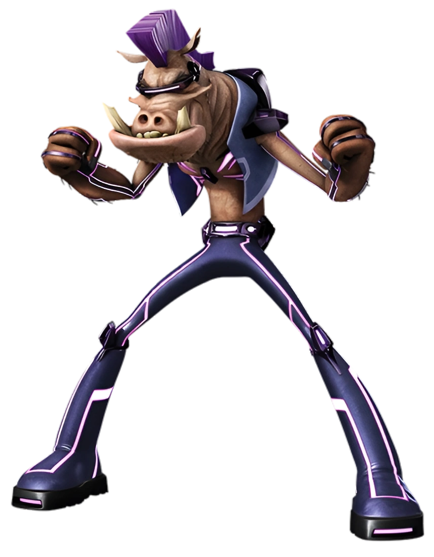 Bebop is a thin humanoid mutant warthog with a short left tusk, long right tusk and the high-tech parts of his suit fused to his body. The top half of his high-tech suit became a vest.