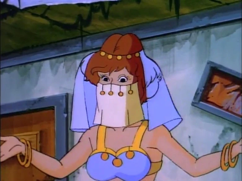 This version of April O'Neil appears in the episode "Shredderville". She and Irma are both harem/serving girls who work at Shredder's headquarters in the Channel 6 building in this alternate world.