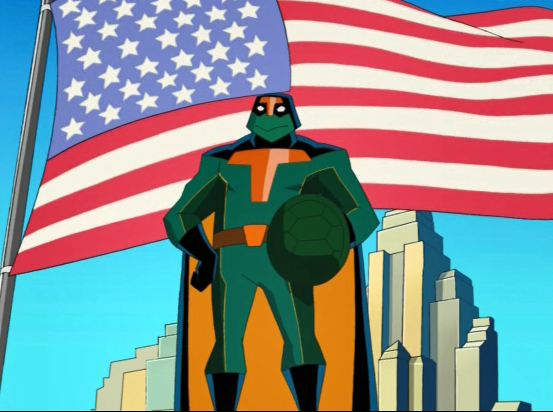 Later, both Titans land on a building ledge. The current Turtle Titan takes off his mask and explains that he is actually Silver Sentry’s grandson. As he wasn’t born with any of the Sentry’s powers, he decided to use Mikey as an inspiration and became the new Turtle Titan - a super-hero without any super powers. The man then hands the ninja his mask, stating that there's only room for one Turtle Titan. Mikey has a sudden change of heart and gives his new friend the mask back, stating that he's had enough super-heroing to last him another century. With that, Mikey activates his grappling device and swings off into the night with a cheerful Turtle Titan following him after being called citizen.