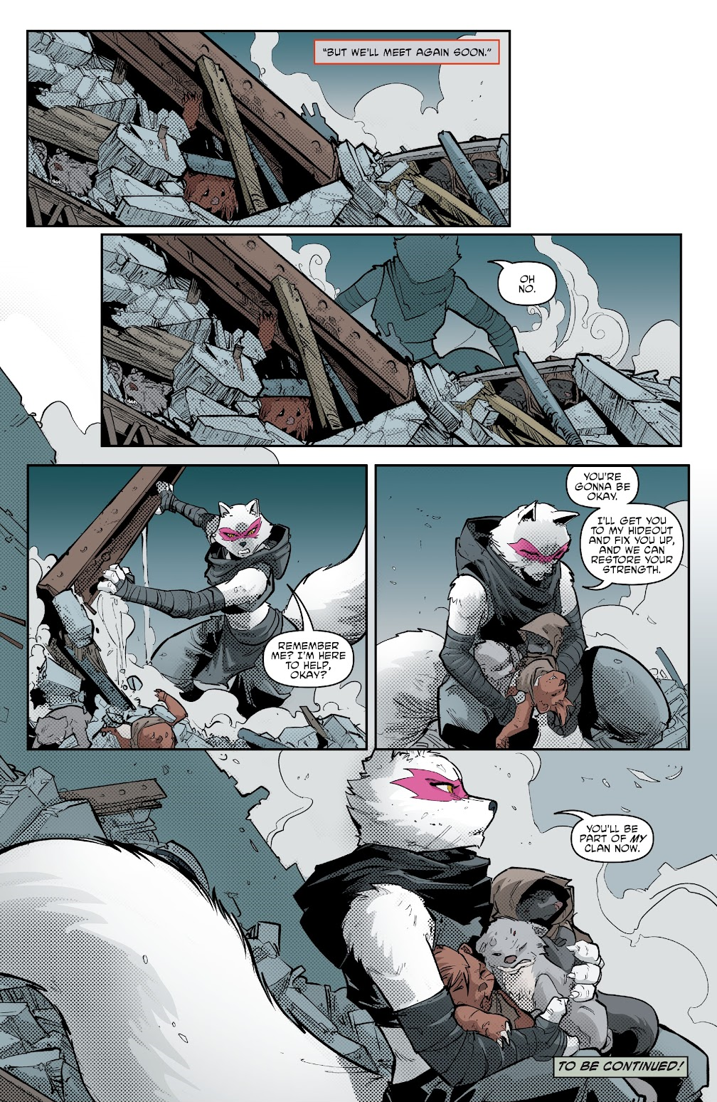 After the death of Man Ray Alopex found the Weasels in the pile of rubble. She took the mutant children back to hideout to nurse them back to health and promises they could join her clan. TMNT #138 (IDW)