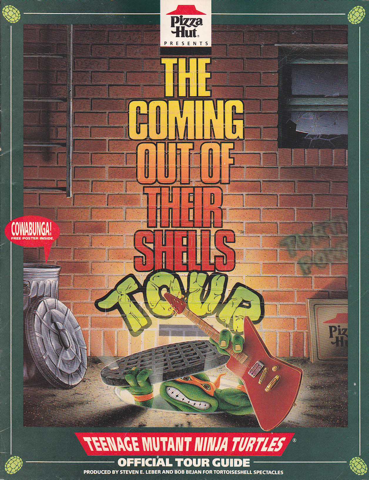 Coming Out Of Their Shells was a studio album, and subsequent ive musical tour that occurred in 1990. The tour was endorsed and sponsored by Pizza Hut. The very first showing of the tour was broadcast live on Pay-Per-View. A VHS recording of the broadcast was made released, as well as a "Making Of" direct to home video. The tour is generally lambasted for its terrible costumes and wafer-thin plot. The band featured Donatello on keys, Leonardo on bass guitar, Michelangelo on guitar/lead vocals & Raphael on drums/percussion/tenor saxophone/vocals. Guest vocalists include Master Splinter, April O'Neil, and The Shredder.