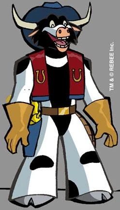 A Holstein bull who is the youngest of the C.O.W.-Boys. He wants to prove himself, and in his spare time a self-proclaimed ladies' man with a good singing voice, regardless of his skill with the lasso and guitar. Cowlorado Kid isn't a deputy yet. In "Stolen on the River," he tries to prove he's worthy of being a deputy by catching Five Card Cud only to get in trouble and be rescued by Dakota and Moo. His horse's name is Jezebel.
