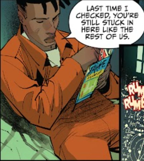 Creager is resting on his bed nearby, thumbing through a magazine. He acknowledges Stockman’s thanks, calling him Dr. Egghead. Then he says that the last time he checked, Stockman was still stuck in there like everyone else. He asks if Stockman has some sort of special parole no one knows about. There is a rumbling sound from just outside the wall and Stockman says yes, he could say that. The wall then crashes inwards, heralding the arrival of Rocksteady and Goldar. There is no sign of Creager at this point and no indication as to what might have happened to him.