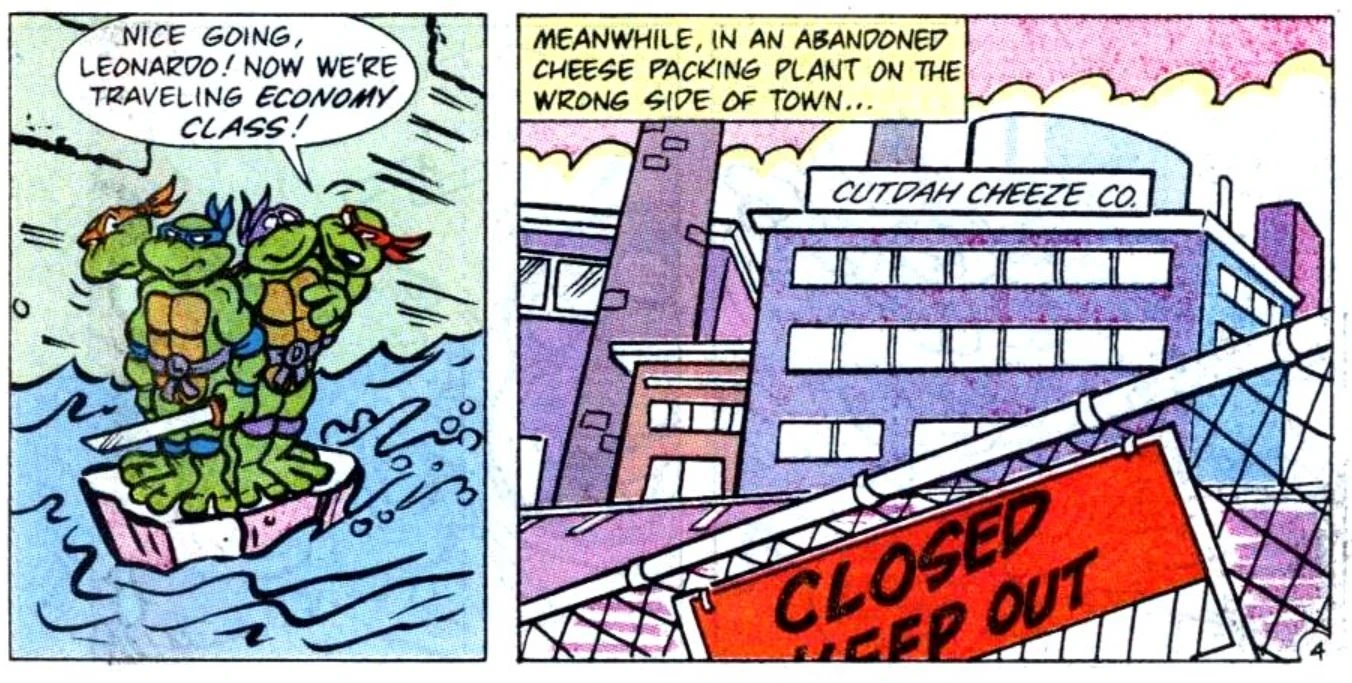 Cutdah Cheeze is a New York City cheese packing company, appearing in Teenage Mutant Ninja Turtles Adventures by Archie Comics. Inside its building, the final battle between the Turtles and Shredder in The Incredible Shrinking Turtles takes place.