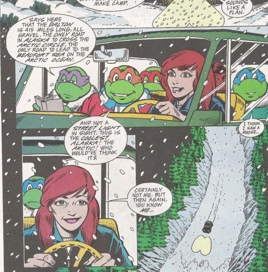 In the Archie Comics issue Of Wolves and Men, the Ninja Turtles, April O'Neil and Ninjara ride in a van across the snow-covered ground, being on their way back from the Fairbanks International Airport.