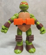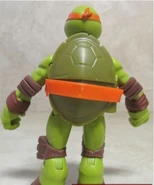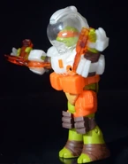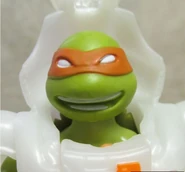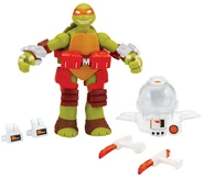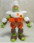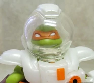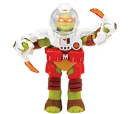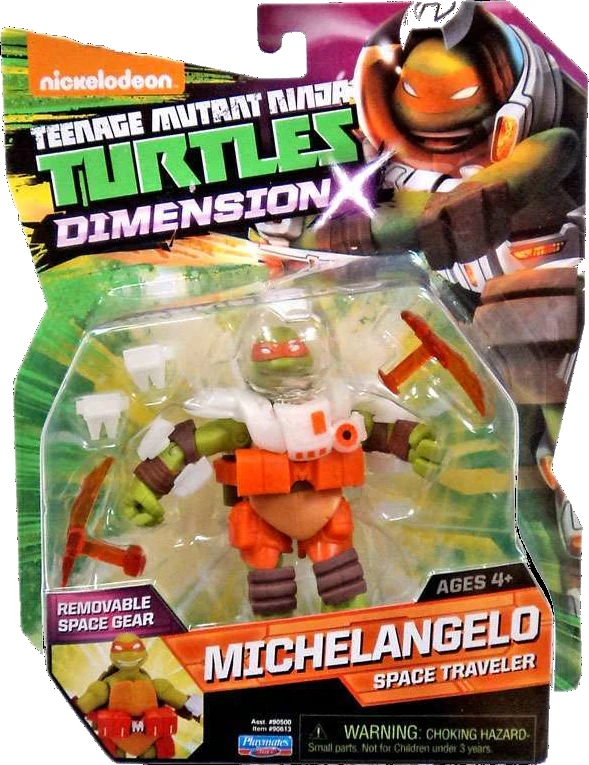 Michelangelo comes with Dimension X nunchuks, helmet, and play oxygen converters and alien decryption translators.