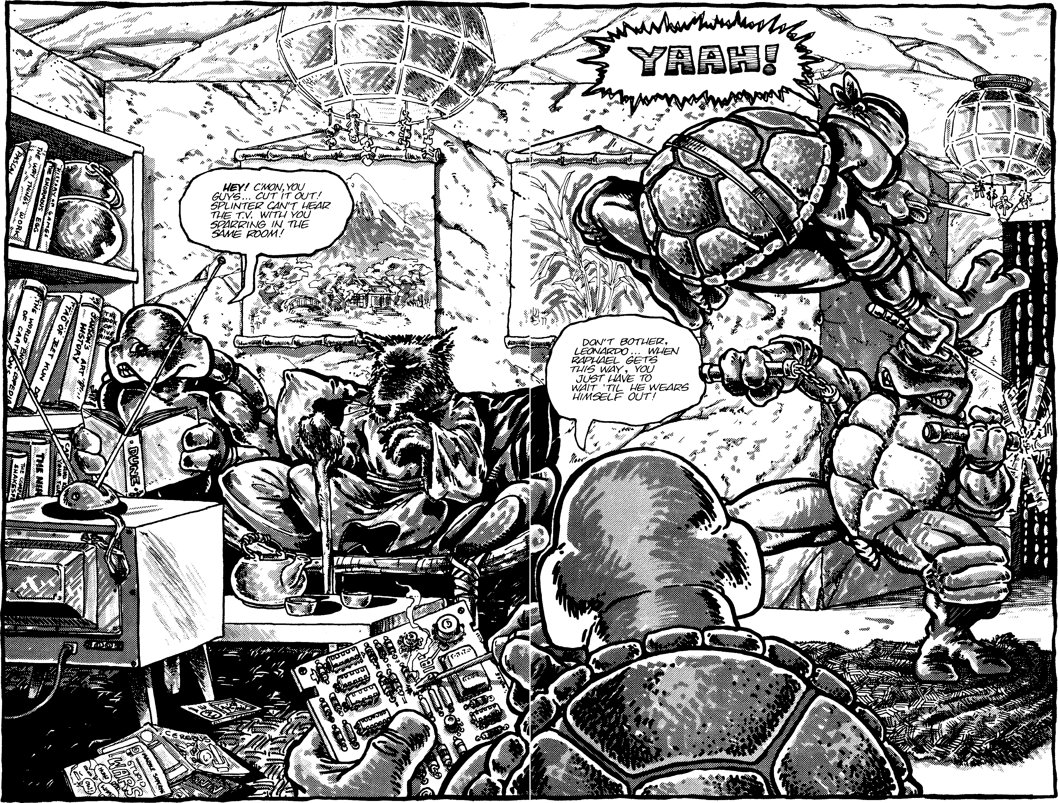 This lair features in various TMNT stories that take place during the turtles' earlier lives (such as Not Forgotten), but it must be abandoned after volume 1 issue 2 when it is discovered and partially destroyed by Baxter Stockman's Mousers. The turtles are given a new home in April O'Neil's apartment in the Second Time Around building, and Splinter joins them later after the destruction of TCRI.