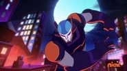 The Purple Dragons then reveal themselves as the ones behind The Purple Game, as they have wanted their revenge since the events of "The Purple Jacket". They then force Donnie to watch his brothers being relentlessly attacked by the now fully self-operated mech.The other three, however, have no idea of Donnie's encounter with the Purple Dragons, and is still under the impression that their brother is attacking them. They barely dodge a violent blow from the mech through Leo's portal and together they intend to destroy the mech using Raph's mystic power-up. The mech catches them however and almost crushes them in its fist.