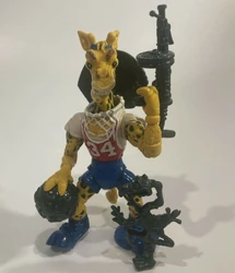 The home team advantage goes to Halfcourt, the jumpshot jammin’ giraffe. With his beehive basketball pumped and primed, Halfcourt’s ready for some rough one-on-one action with any Foot fool who dares to come out ‘n play. Halfcourt’ll pump ’em up with his tire pump pistol and dribble ’em straight to a slam dunk – that’s two points for the Green Team! It’s always a game of sudden death when the Shredhead tries to take on Halfcourt. But with the help of his extendo neck, Halfcourt’s got the height and the skill to score. And with his attachable backboard shield, Halfcourt is always ready for a game or good fight. He’s one Turtle Team player who knows the score – Turtles win, Foot Clan loses! So all you street warriors out there, watch out for the baddest blacktop bouncer to ever bash a backboard. He’s Halfcourt, and when he shoots – he scores!
