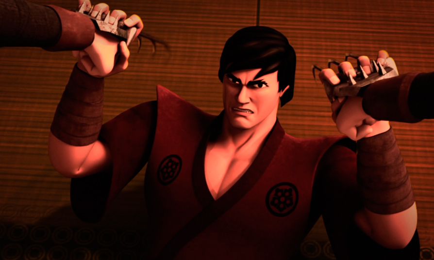 Yoshi's skills were only rivaled by fellow student Oroku Saki, who was Yoshi's adoptive brother, originally from one of the wiped out rival clans, the Foot. Not only were they rivals in Martial Arts but also for the love of a beautiful woman named Tang Shen, who eventually chose to marry Yoshi. Saki could not accept this and once insulted Yoshi in front of her. Yoshi made the mistake of losing his temper and struck Saki to the ground. This attack solidified Saki's hatred for Yoshi and he vowed revenge. During this time, Saki learned of his true heritage and rebuilt the Foot Clan, rechristening himself as "the Shredder". One night, he came to Yoshi's home armed with razor sharp claw weapons and challenged him to a duel to the death. Yoshi accepted, and the two tore through Yoshi's home, catching it on fire. Just as Saki was about to kill Yoshi, Shen interfered and took the fatal blow for herself. Yoshi barely escaped without knowing the fate of his baby daughter Hamato Miwa, assuming her to also be seemingly killed, but in reality Shredder secretly abducted her and raised as his daughter, Karai.