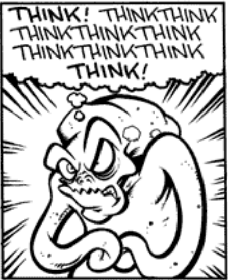 The final adventure posted by Donatello’s Adventure Machine, before it was smashed by Casey Jones, was titled “The Hideous Brain-Munching Alien Beastie”. Michaelangelo expresses relief that the machine was broken before that particular adventure started and Leonardo concurs. Meanwhile, in outer space, the Hideous Brain Munching Alien Beastie suddenly has an urge to munch mutant Earthling brains and directs the computer to make a right at Mars.