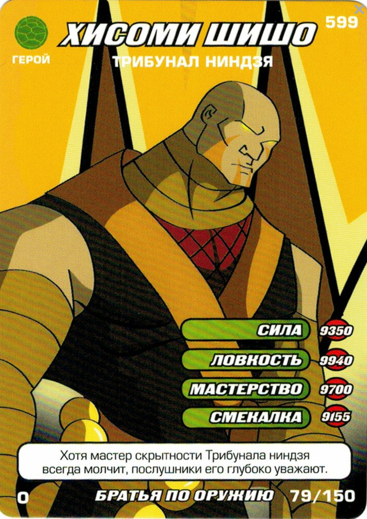 Hisomi-Shisho, Ninja Tribunal is the 79th card of the third set of Teenage Mutant Ninja Turtles: Way of the Ninja. It is only known to have been printed in Russian. Classification=Hero.