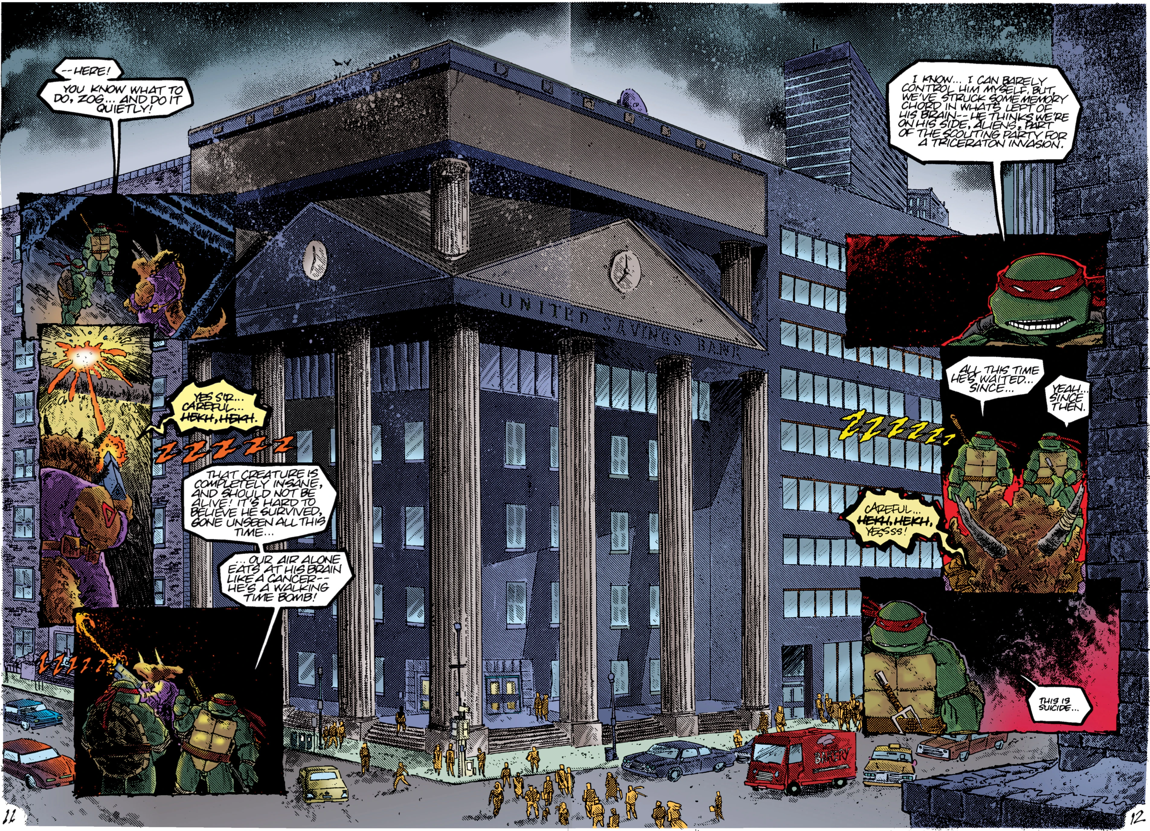 In the Return to New York arc, an insane Zog guides the turtles (whom he thinks are fellow Triceraton soldiers) to an underground Foot data center, where they learn of Hudson Block's true nature and internal schematics. The turtles use this information to infiltrate and assault the Shredder's organization at its source, the result of which is the Shredder's death at the hands of Leonardo on Hudson Block's rooftop. With the Shredder's demise comes the collapse of his organization into splinter factions (which would resurface in the City at War arc), but Hudson Block never again figures as a plot-significant location.