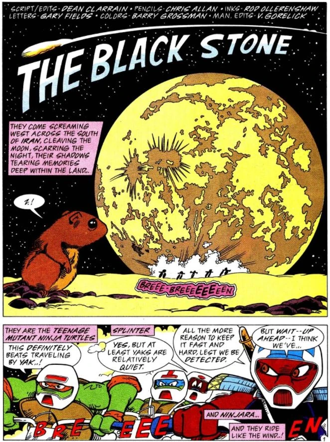 The Ninja Turtles, Splinter and Ninjara travel across Iran by motorcycle at the beginning in the TMNT Adventures comics issue The Black Stone when traveling towards Saudi Arabia. When reaching Jask, they sneak onboard an Oman-registered oil tanker ship.