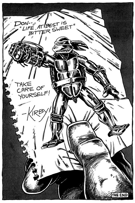 The human fighters thank Kirby, calling him a "mighty sorcerer". Donatello tells him that they should probably go home, although Kirby shows interest in staying around in this world and exploring. But then both of them notice that the doorway from whence they came is shrinking. Kirby tells Don to go through first and helps push him through. Realizing that he won't be able to make it through, Kirby sends a note through the doorway instead; Don--"Life at best is bitter sweet" Take care of yourself! -Kirby