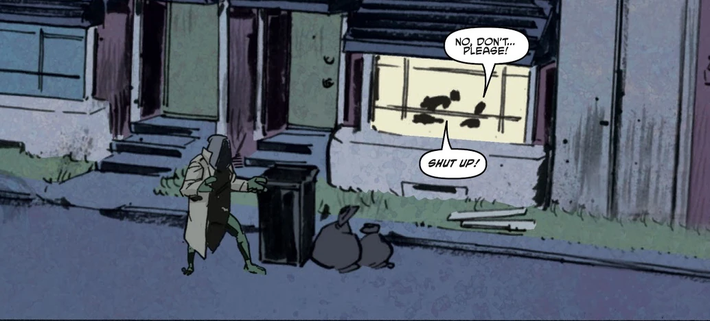 The house is first seen in Change is Constant, part 1, when the then-homeless Raphael overhears one of Arnold's fits of violence, and breaks through the front door to protect Casey—this is how Raph and Casey first meet.