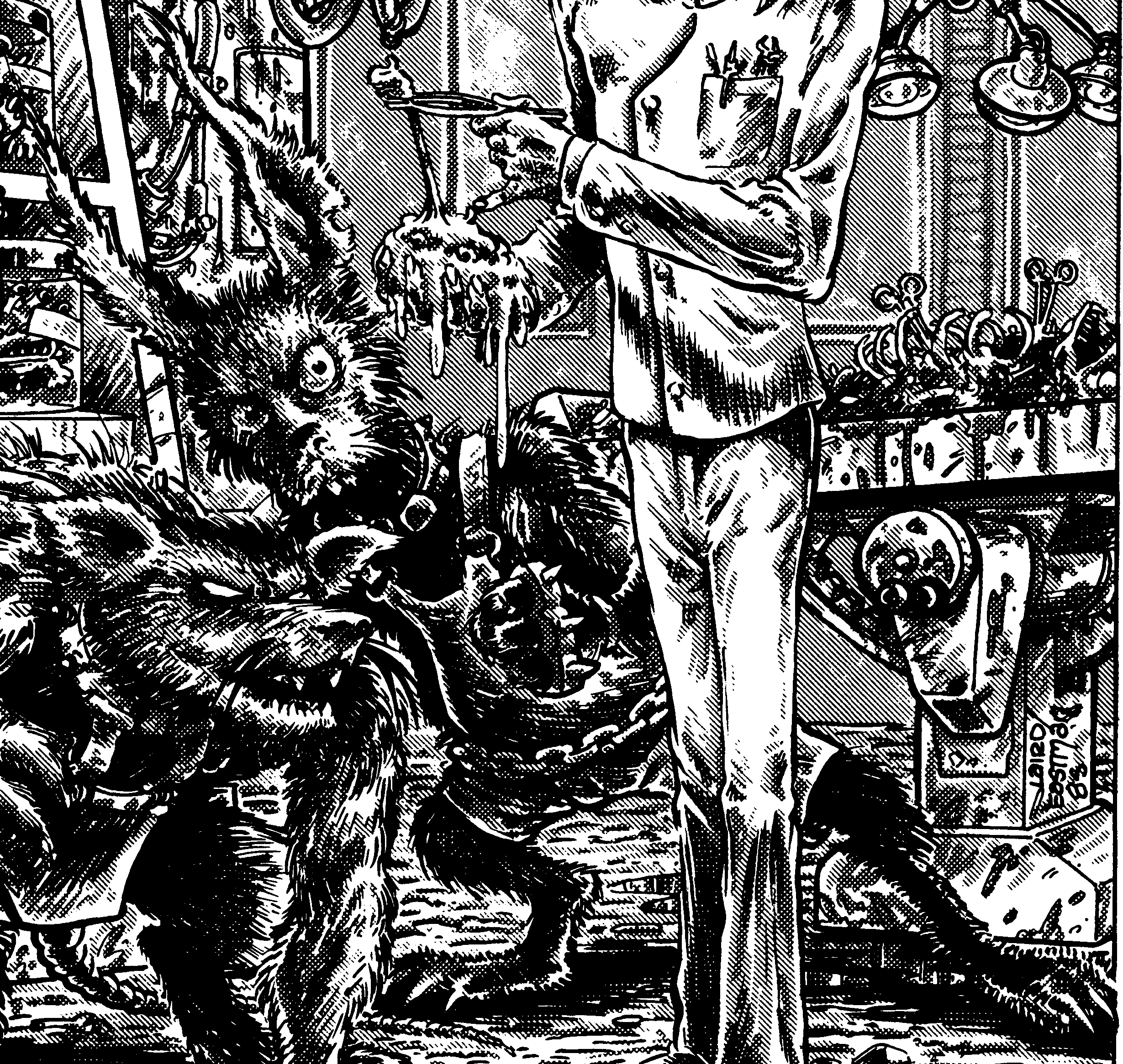 Karl may be the chief assistant of Feral's secret underground laboratories, but he hates it, and he hates Feral, and the only thing keeping Karl from trying to escape is the control collar Feral has surgically installed in Karl's neck. This is not to say Karl is that sympathetic a character either, for he is also genuinely evil and does nothing to disguise it. He is arrogant, mean-spirited, and takes joy in inflicting suffering. But he's also quick to obey Feral and agree with him, knowing that Feral is capable of killing him in an instant. Karl also strikes a balancing act by trying to appear intelligent but not too intelligent, so as not to gain enough of Feral's curiosity to end up on the vivisection table himself.