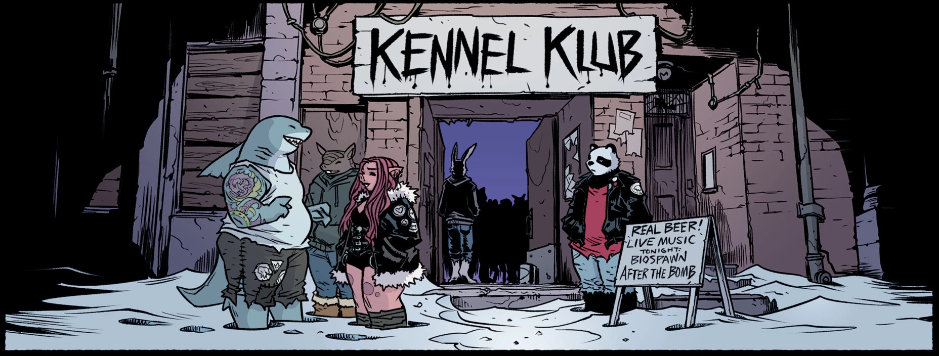 In the IDW continuity, Kennel Klub is heavy metal nightclub located in New York City's Mutant Town. At Kennel Klub, clubbers can dance and drink in the presence of live musical performances by mutant metal bands such as After the Bomb, Bat Brains, Biospawn, The NYC Dogs, and Rabid. It is not considered a place for children.