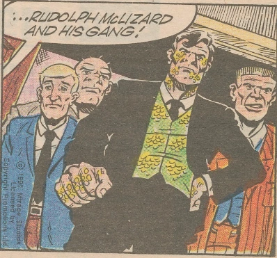 The Lizard Gang is a criminal organization in the Teenage Mutant Hero Turtles comic strip story line The No-Joke Affair. Mob boss Art E. Choke hires them after being frustrated with Shredder's inability to defeat the Hero Turtles. The Lizard Gang robs a bank to get the Turtles' attention, but they get beaten by the Turtles. Their leader, Rudolph McLizard, however, knocks out Michaelangelo with one punch, forcing the others to retreat to tend to his health.