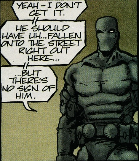 Nobody is the superhero identity of Officer Longer (first name unknown), a police officer who spent his nights stopping crimes that he couldn't touch within the law during his day job. The turtles met him during a night on the town in Northampton following a bout of boredom. During a restful stay at Casey Jones' farm in Northampton the Turtles met a masked figure dressed all in black who was chasing a truck and was apparently involved in a shooting.