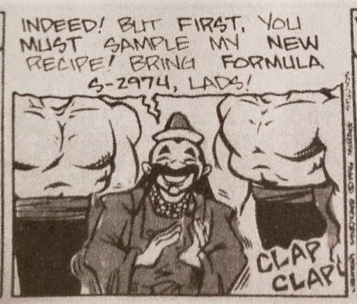 After Oopsie goes missing, Michaelangelo begins searching everywhere, even going so far as to hang reward posters. He begs Raphael to help him, which he agrees to do. Raph takes Mike to Mario Chan’s Ninja Equipment and Pizzeria. At the secret back entrance, Raph gives the code reply, and the door is opened by Master Mario Chan. The Turtles begin to tell Master Chan that they seek an alien baby, but he already knows about Oopsie. Michaelangelo expresses surprise, but Master Chan tells them that the ways of the ninja warrior are known to him... not to mention it's all over cable news. Master Chan agrees to help the Turtles before it is too late and he sends his number one son, Luigi-Sing with them to help find Oopsie. Before proceeding onto his mission, Luigi-Sing tells the Turtles he must don his ninja apparel. He comes back to them wearing a pair of bunny ears, as he is a warrior of Master Chan's Bunny-Ear Clan.