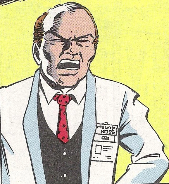Dr. Melvin Koss was Perri Grey's boss at Mergenterprises. When he encountered his intern about to show April O'Neil around the facility, he denied her access. As April was leaving, she witnessed Shredder's henchman Tim London delivering chemicals to Koss, and she became suspicious. Later that night, she returned to Mergenterprises, where Grey was also investigating Koss' behavior, and they saw him working with the evil Grem aliens. After the defeat of the Grem, however, it turned out that he had been brainwashed by them. The Fifth Turtle