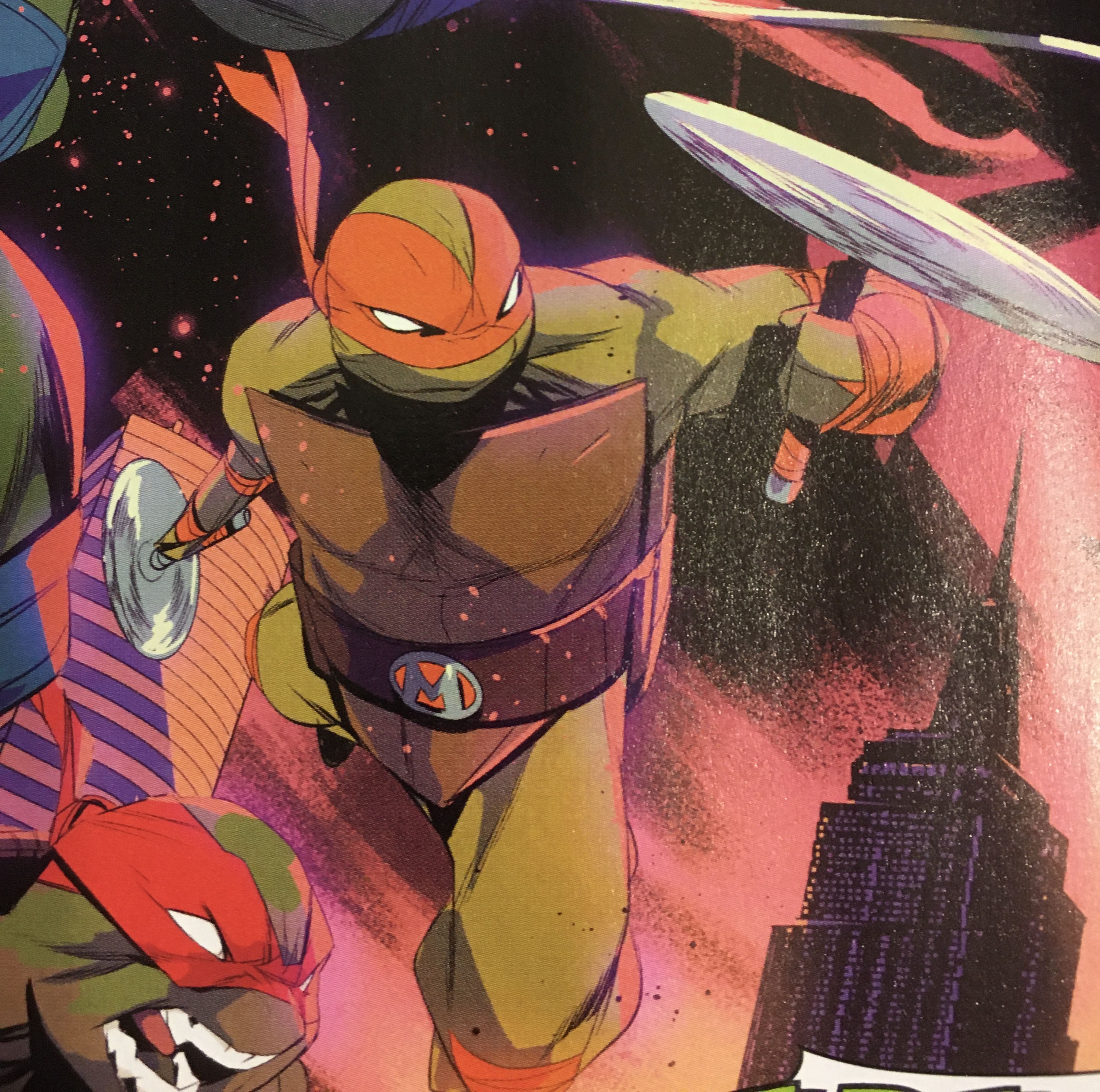 Mikey and his brothers encountered the Foot Clan on a rooftop in New York City, and during the fight he and Donatello discussed the things they would like about being human. They witnessed a ninja - whom they nicknamed "Steve" - overwhelm Raphael, though the Turtles were able to defeat the Foot overall.