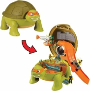 - Pet Mikey turtle opens to a skate park training Playset, with 2 battle platforms, surprise ejection chair, a removable skate ramp, and a connecting escape sewer tunnel.