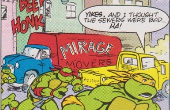 A truck labeled "Mirage Movers" appears in the Teenage Mutant Ninja Turtles Adventures comics issue Heroes in a Half-Shell! Part 1.