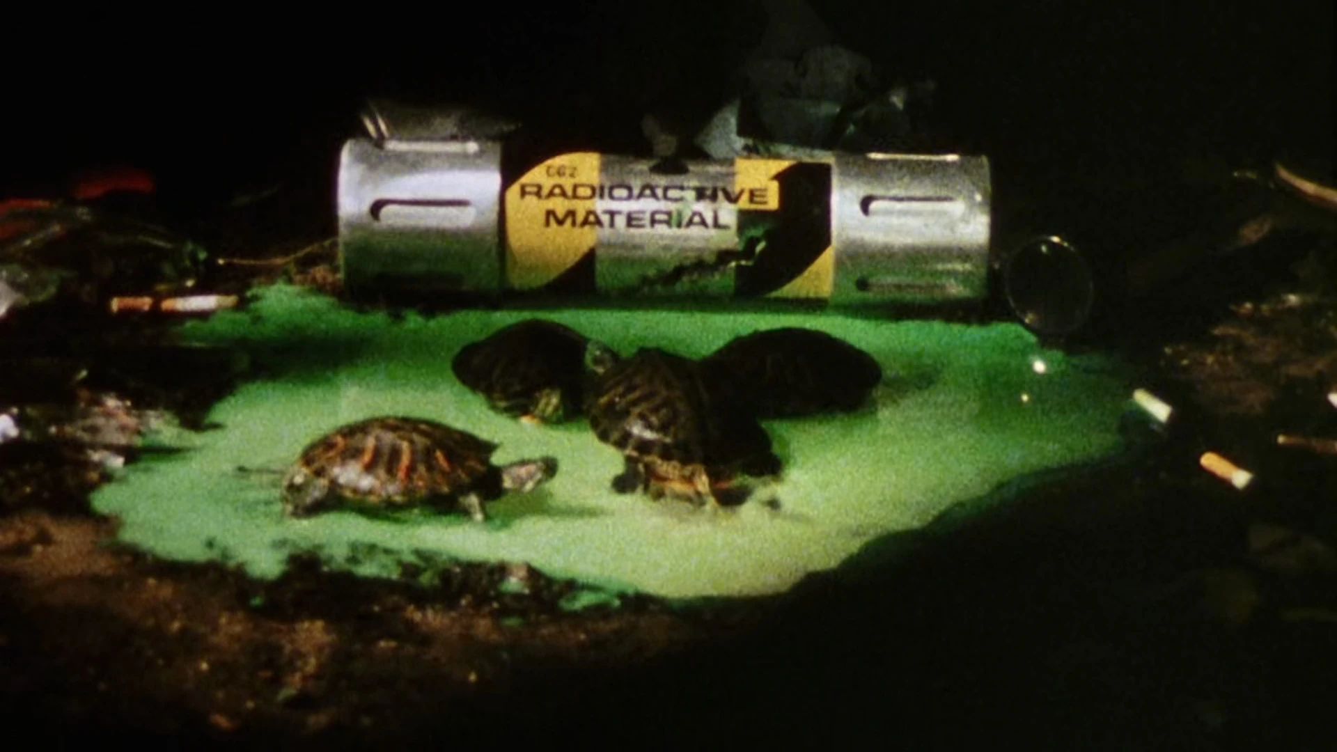 As opposed to being labeled "T.C.R.I." (Techno Cosmic Research Institute) like in the Mirage comics, the canister containing the ooze is labeled as "T.G.R.I." (Techno Global Research Industries) to fit the film’s plot. Thus, the company's activity is identified as "Global" rather than "Cosmic".