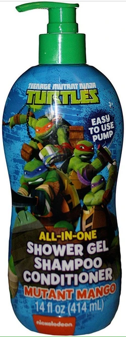 Teenage Mutant Ninja Turtles Mutant Mango All-in-One is a bath product released by GBG Beauty in 2013. It features the Ninja Turtles on the bottle and is one of several products the company released with the "Mutant Mango" scent. The "All-in-One" product is a combination of body gel, shampoo, and conditioner.