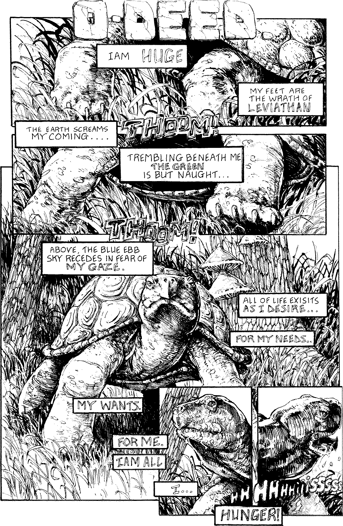 Stomping out of some brush, a tortoise thinks to itself that it is a god; that the only thing that matters in the universe is its own desires. And what it desires is food.