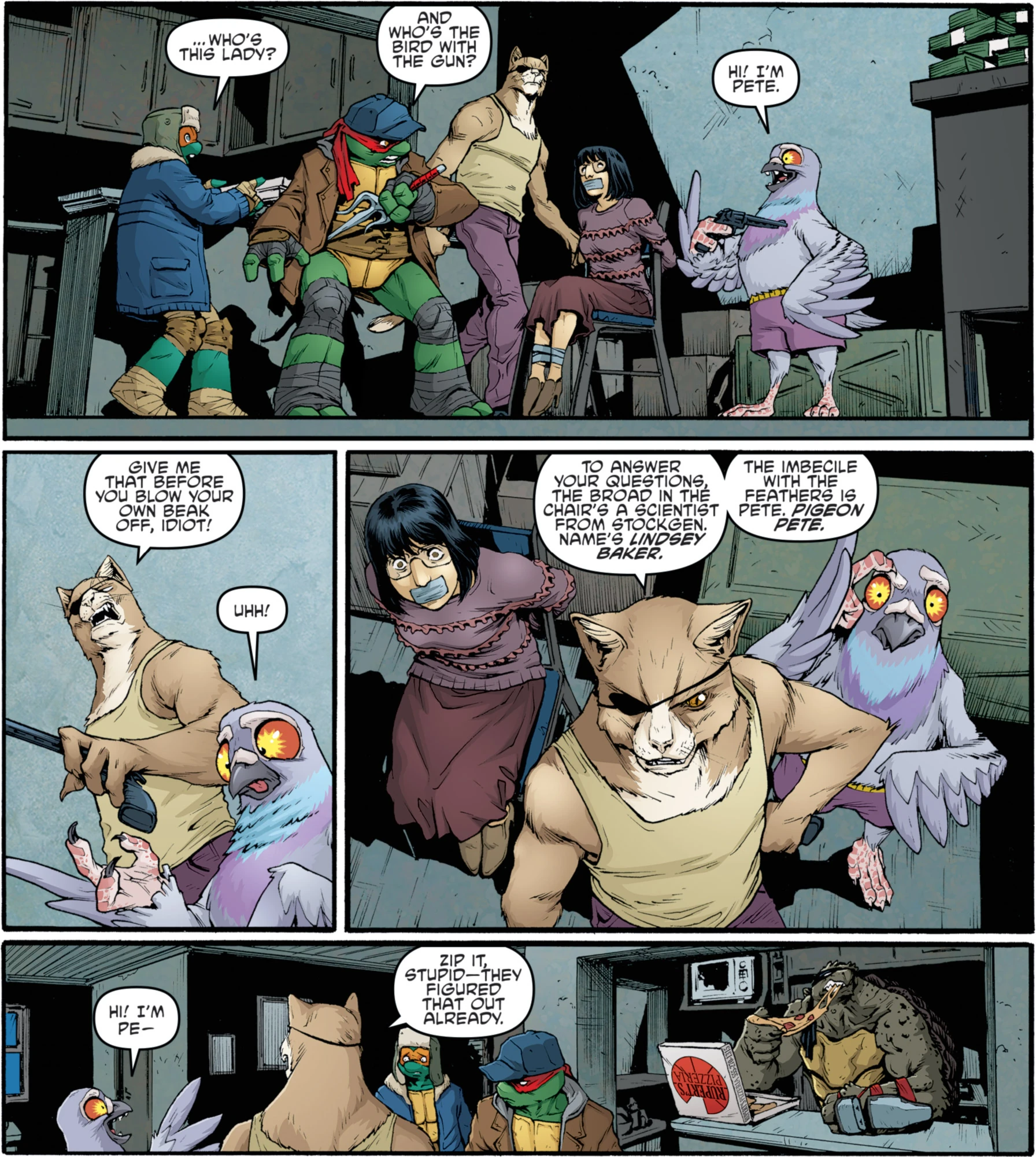 In the story arc "City Fall", the characters Old Hob and Slash were living together in an apartment where they also stored their weapons. A gang sign marked on the building's outer wall indicated that it was located within the territory of the Purple Dragons. Splinter visited the apartment to arrange a pact: Splinter would infiltrate StockGen to steal mutagen for Hob to build a mutant army for the stated purpose of protecting other mutants, and back up Hob in these goals. And in exchange, Hob and his mutants would back up Splinter and the Turtles in their fight against the Foot Clan. In the "Monsters, Misfits, and Madmen" arc, Hob and Slash were still living in the apartment, but were now joined by Pete, whom they had changed from an ordinary pigeon with the mutagen Splinter provided. Hob abducted Lindsey Baker and took her to this apartment to try to coerce her into helping him build more stable mutants. When a sample of Splinter's blood containing the psychotropic compound was injected into Slash and greatly enhanced his mental faculties, Lindsey agreed to stay and work with Hob, as his goals and her mutation research goals now overlapped. But Lindsey insisted that the apartment's conditions were inadequate to use as a laboratory and needed to be upgraded.