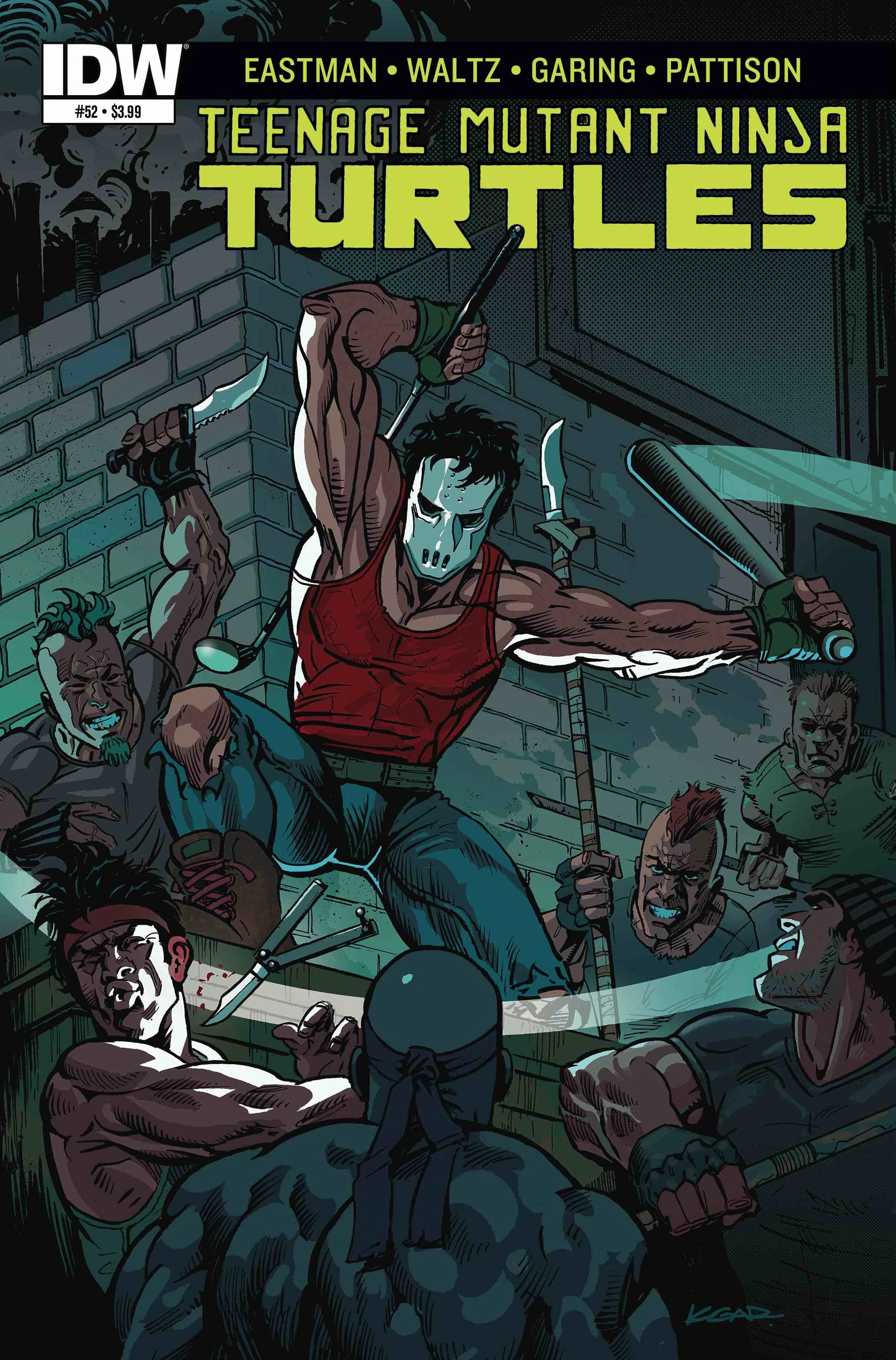 Angel walks past the Second Time Around shop in her neighborhood when she sees Casey beating up some punks in an alleyway. Casey knocks them out and greets Angel, who asks him why he had to confront the punks. Casey explains that he was being preemptive and taking down a threat before it became a problem. Casey tells Angel that she and April should go catch up (as April has been out of town with Casey, see the mini-series for the full story). Casey tells Angel that he’s got to continue patrolling their turf, as he can’t let their enemies see any sign of weakness.