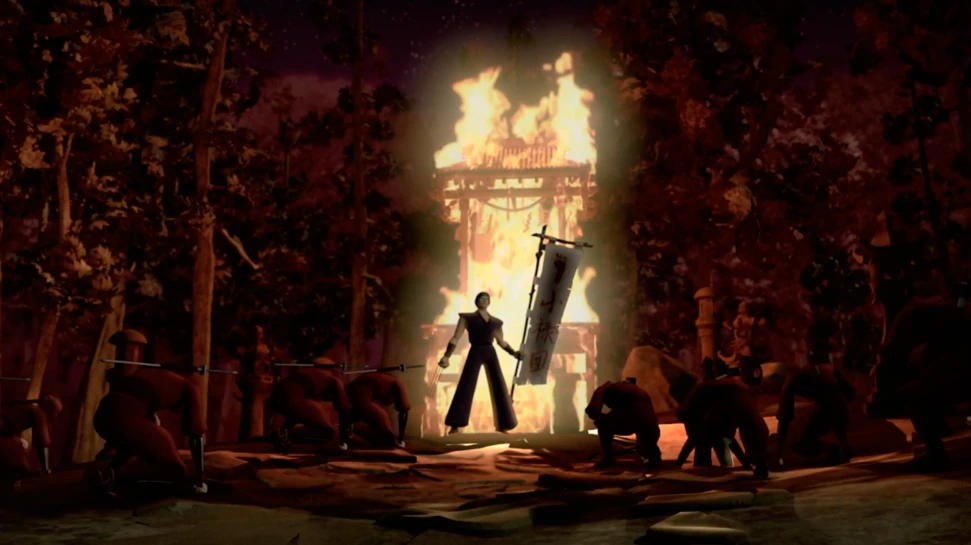The end of Oroku Saki/Super Shredder being consumed in flames and then brutally murdered by Leonardo.