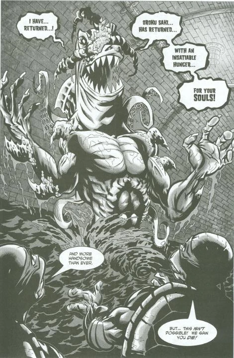 In issue #3 and #4 of Tales of the Teenage Mutant Ninja Turtles Vol. 2, it is shown that a few weeks after Leonardo defeated the Shredder, he had yet another resurrection of a sort. A Foot Mystic named Mashima would find the remains and use the mysterious worms that created Shredder's clone body again, which had gained sentience. The worms then went out to find a new body, but this time they'd also eat the remains of a shark. This shark monster retained Saki's memories and considered himself the real Oroku Saki. This creature had wasted no time and started his revenge against the Turtles and Hamato Splinter by kidnapping him. Facing the Turtles, who defeated it, after a long struggle, in which, by the mysterious abilities of this new creature, the personalities of the Turtles were turned upside down. By severing it's connection to the mystic, he realized he was just a clone and escaped, also eating the Foot Mystic. Sometime later, the monster returned in issue #33, however, and had the Foot kidnap Casey's stepdaughter Shadow to lure the Turtles into a trap. With the Turtles away this Shark/Worm/Shredder monster would face Splinter and Casey Jones. They managed to defeat this incarnation of Shredder with the help of the Foot Mystic Mashima, who had meanwhile merged with the Shredder Shark clone, and rescued Shadow finally killing the creature.