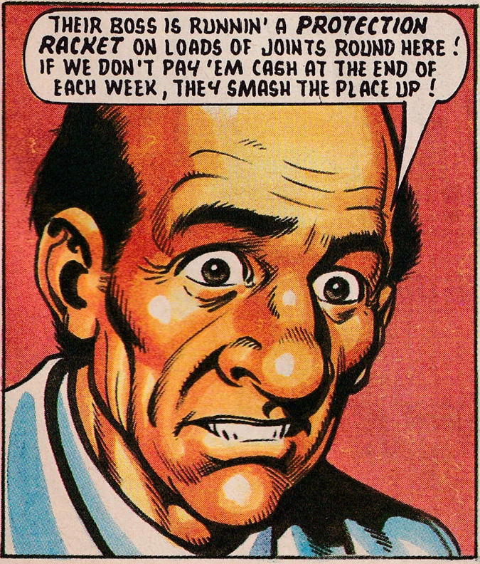 The Turtles intervene and knock out both thugs. Donatello asks Pete if he knows the creeps. Pete explains that their boss is running a protection racket on a lot of businesses in the area. If they don’t pay them cash at the end of each week, the thugs smash their places up. Raph asks Pete for the names of the other places being terrorized, because this sounds like their kind of job. Pete does supply them with this information.