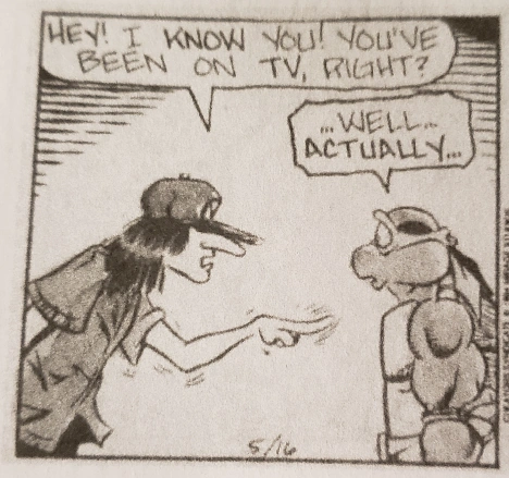 The pizza delivery dude continues to wait as the Turtles ask Splinter for the money, but they get a lecture on money management instead. Then the pizza dude suddenly tells Mike that he thinks he knows him and asks if he's been on TV. Mike starts to respond with "well, actually..." but is interrupted as the pizza dude starts guessing all sorts of places where he might know the Turtles from. He finally becomes very excited and shouts that he's got all of their records and he loves them. He says he saw them open for Metallica once and that they rock. The pizza dude then tells them to take the pizza because he can't charge them. He leaves them with the pizza and makes his exit.