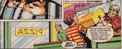 When Shredder decides to starve the Turtles by making the city a pizza-free zone, his first stop is Pizza World. Shredder, along with Bebop and Rocksteady who are both armed, approach the counter. When the stammering owner asks if they want takeaway or eat in, Shredder says to give him every pizza he can make and do it fast. Soon, Footbots are marching out of Pizza World with stacks of boxes containing pizza. The owner says they’ve been cleaned out, and Shredder orders him not to make any more or he’ll set Bebop and Rocksteady on him. To prove his point, both of the mutants open fire on the glass windows behind the counter and the owner agrees that they are closed permanently.