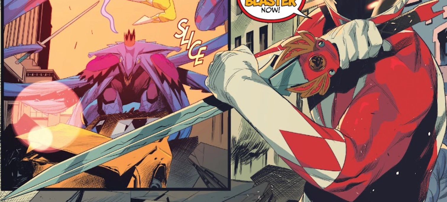 The Power Sword is seen partially embedded in a floor on the very first page of the first crossover comic. It is wielded by Jason during the events of the first issue and is used to form the Power Blaster, which destroys Apocalyptopus. MMPR/TMNT #1
