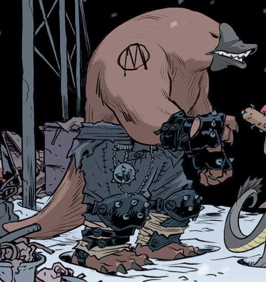 In the IDW continuity, Puggle is a human-born mutant platypus and mutagen bomb victim who, during the six-month time skip between issue #100: City at War, part 8 and issue #101, became one of the residents in the newly-quarantined Manhattan neighborhood of Mutant Town. Puggle, along with some other fellow mutants such as Bandit (his boyfriend) and Diamond, was recruited into Old Hob's Mighty Mutanimals to help enforce Hob's interests within the neighborhood's walls.