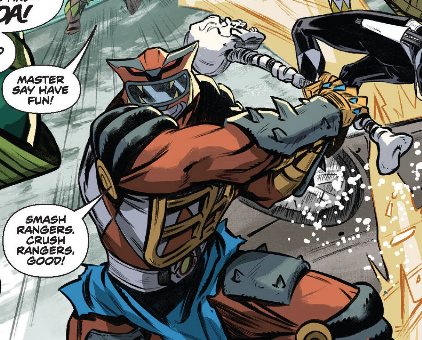 Billy, Tommy, and Alpha 5 are conferring with Zordon. The moment Master Splinter was ionized, Billy picked up a massive energy surge. When Zordon reminds them that Lord Zedd is very powerful, Billy tells them it wasn’t on the Moon. The surge, he says, came from an entirely different dimension in an unexplored region of space. Zordon asks to be sent the location so it can be cross-referenced with the archives. Alpha 5 interrupts to say two massive energy signatures are teleporting down from the Moon. One is in Sydney, Australia and they appear to be Tokka and Rahzar, both pulsing with morphin energy. The second is in Tōkyō, Japan and it’s Karai and Leatherhead. Both pairs have Z-Foot Soldiers with them and are already destroying the cities. MMPR/TMNT III issue 2