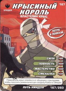 Rat King, Lord of the Rats is the 167th card of the first set of Teenage Mutant Ninja Turtles: Way of the Ninja. It is only known to have been printed in Russian. Classification=Villain.