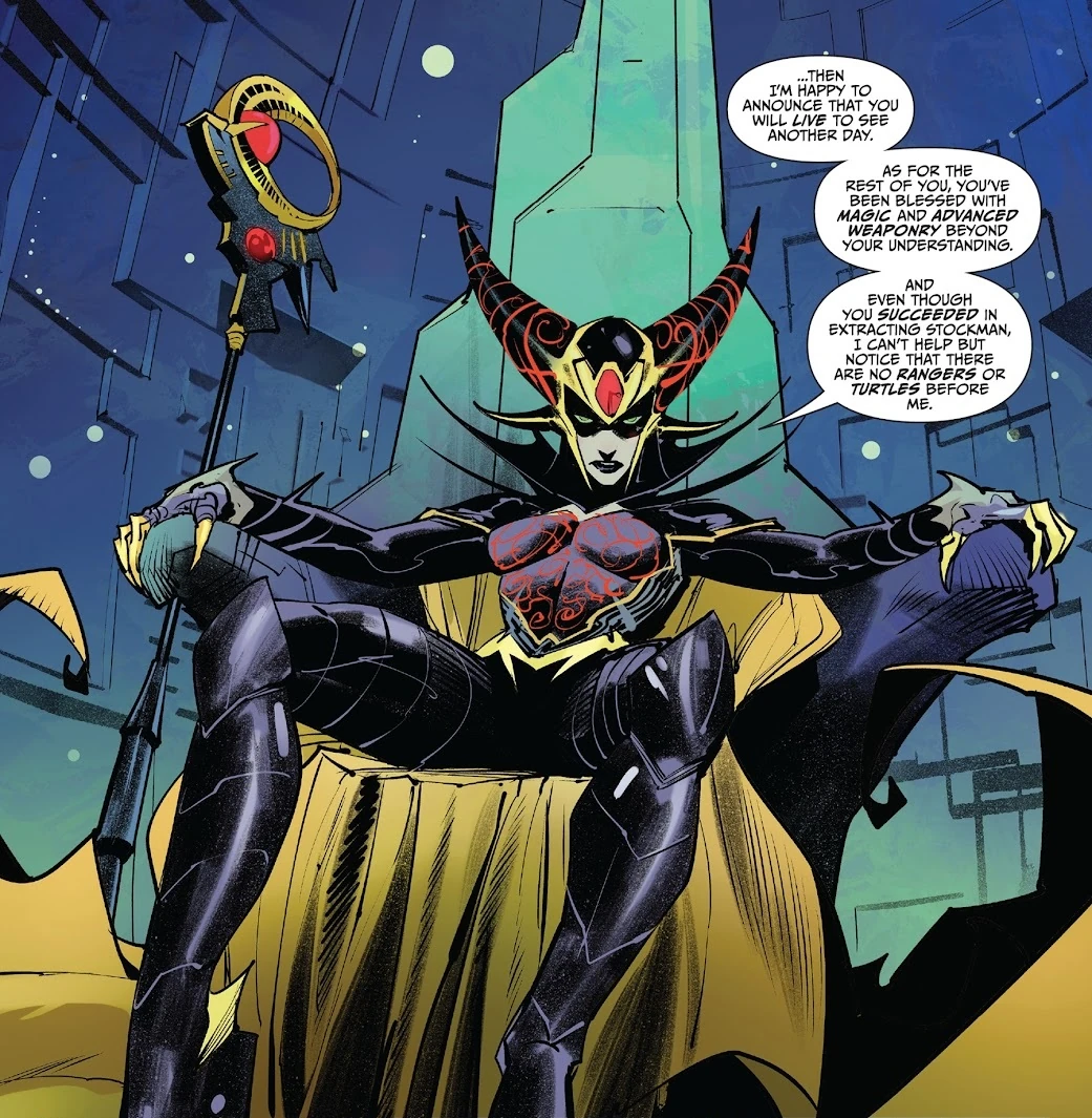 Rita and the other Evil Space Aliens came to Earth to confront Shredder. MMPR/TMNT #2 After the two fight, they draw a truce until the Rangers and Ninja Turtles are defeated, following which they intend to resume their battle. MMPR/TMNT #3