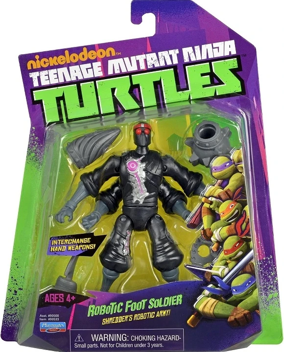 Identical to Shredder's own Foot Soldiers, the Footbots are the Kraang's contribution to Shredder's Clan with Kraang Robot technology inside. These Footbots are stronger and faster than anything the Turtles have seen. As they continue fighting, they learn their enemies moves and improve their own fighting skills against the Turtles. These smart, exceedingly fast and strong Footbots give the Turtles a whole new challenge to overcome. Weapons: Traditional Ninja Weapons, and additional arms with saw, drill, and hook. Team: Foot Clan