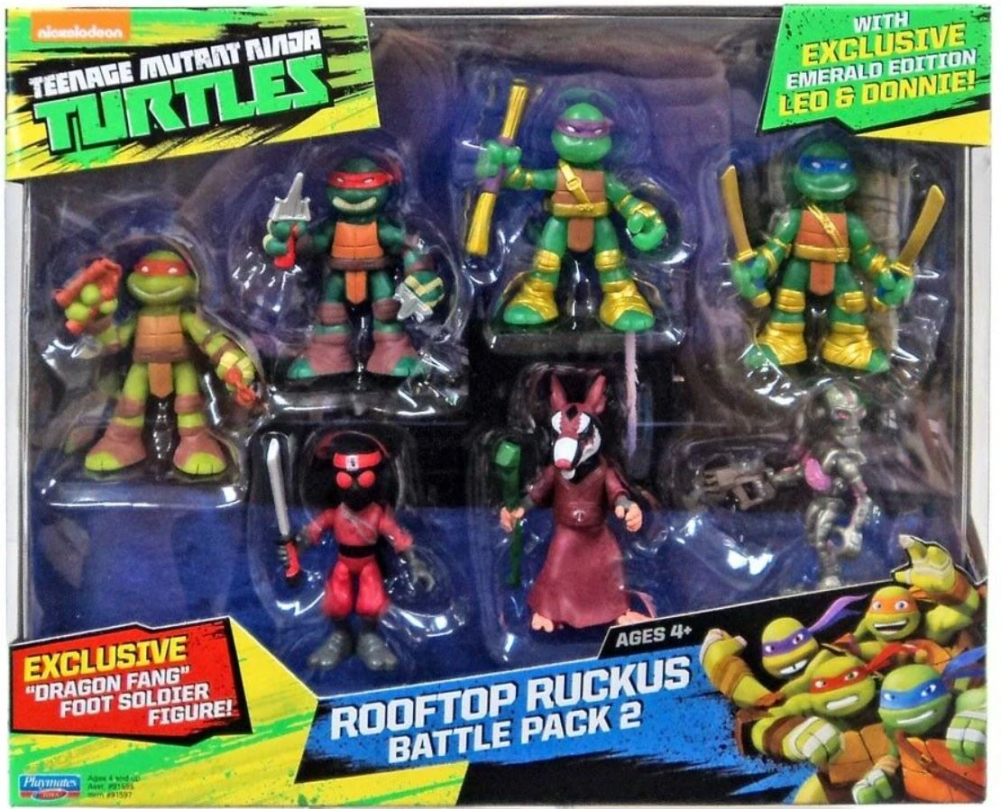 This Teenage Mutant Ninja Turtles Rooftop Ruckus Battle Pack 2 playset includes 7 highly detailed action figures. They will provide hours of imaginative Turtle play! Rooftop Ruckus Battle Pack 2 action figure set figures are about 2 1/2 inches tall and includes: Mikey, Raph, Splinter & Kraang, Exclusive Emerald Edition Leo & Donnie and Exclusive “Dragon Fang” Foot Soldier. Figures are highly detailed and a great addition to your collection! Prepare for battle action. Recommended for ages 4 and up.