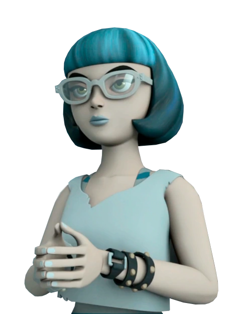 Rook looks similar to the Irma body used by Kraang Subprime, but sports cyan hair with a gray hair clip, light cyan lip stick and nail polish, a gray tank top with another gray teal striped tank top underneath, gray hexagonal bracelet on one wrist and three on the other, gray checkerboard skirt, gray-rimmed glasses, and long, gray boots with high gray socks.