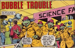 One of the first exhibits they visit is a complicated machine that basically boils eggs. The Turtles next stop is at a device billed as the "Instant Food Machine". The inventor offers them an opportunity to try out the machine, and the Turtles all order pizzas, which are instantly produced. The Turtles finally attend the big presentation held at the Science Fair, which is the unveiling of the Bubble Gun. All goes well until Shredder makes an appearance and disrupts the Science Fair. Bubble Trouble