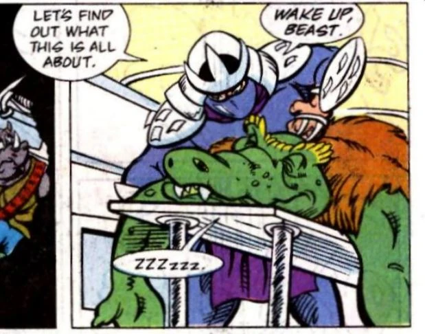 Shredder in his underground headquarters, encountering Leatherhead.
