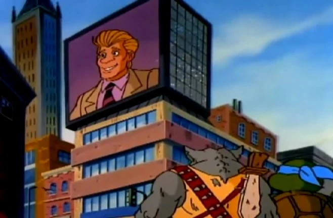 The Skyscraper Square is an area in New York City, seen in the episode Leonardo is Missing of the 1987–1996 series, which is accompanied by a huge TV screen with an announcer, Bebop (in Leonardo disguise) and Rocksteady used the announcement station to entice three of the Turtles to them.